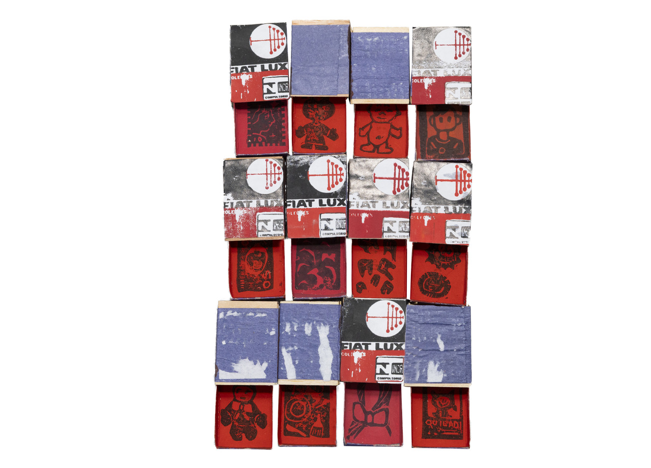 Anual de Arte – Marília Cunha de Souza – Quer espiar minha coleção – guache sobre caixas de fósforo, cola e serigrafia sobre papel-adesivado – 2024.