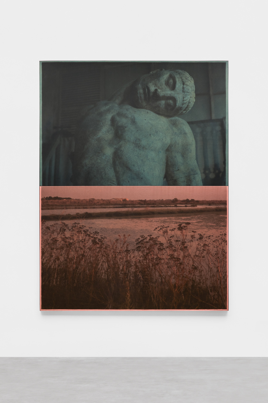 Em destaque, duas obras que serão exibidas na mostra: uma em tecido que faz parte da nova série e um díptico inédito. Corpo de Pedra, 2025, impressão digital pigmentária sobre seda tingida à mão com tintas a base de plantas e, Sem Título, 2025, colagem com impressão em pigmento mineral sobre papel matt Hahnemüle 210g, díptico com dimensão de 167 x 144 cm cada.
