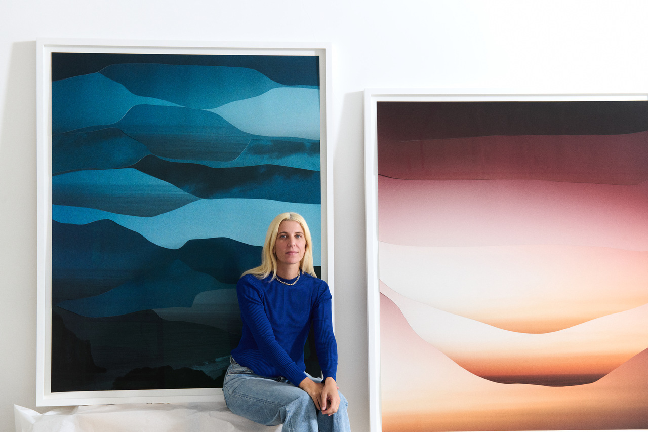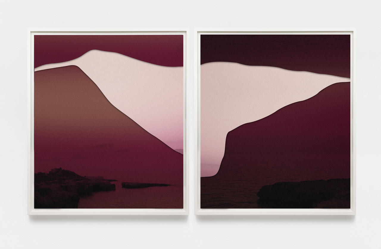 Nas colagens, o gesto do recorte ganha corpo. Fragmentos de fotografias são manualmente cortados, sobrepostos e organizados em camadas que criam passagens visuais marcadas por transições sutis de cor. Esses acúmulos evocam variações de luz, atmosferas e a própria passagem do tempo através de gradações cromáticas. Em certos momentos, a imagem se impõe à experiência direta – não como reflexo do vivido, mas como uma construção que assume o lugar daquilo que se viveu. A paisagem, elemento recorrente em sua obra, é composta por planos em constante disputa, onde fragmentos de céu, terra e mar parecem reivindicar o lugar uns dos outros. Por meio do recorte e da sobreposição, essas instâncias visuais se confrontam e redefinem seus contornos, instaurando uma dinâmica de ocupação e retirada que desestabiliza a estrutura da imagem.